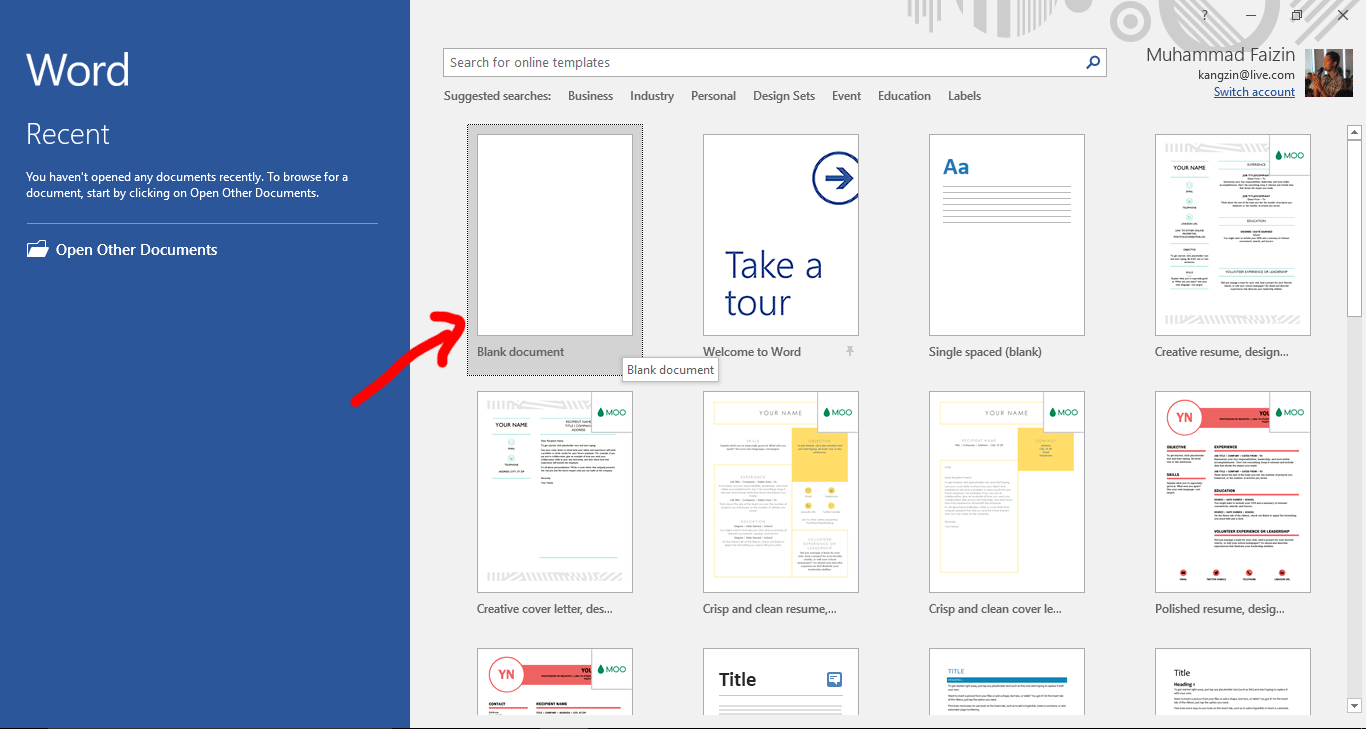 2. Selanjutnya, silahkan buat dokumen kosong baru atau blank document. Untuk Word 2016, tampilan tersebut akan muncul setelah Word terbuka.